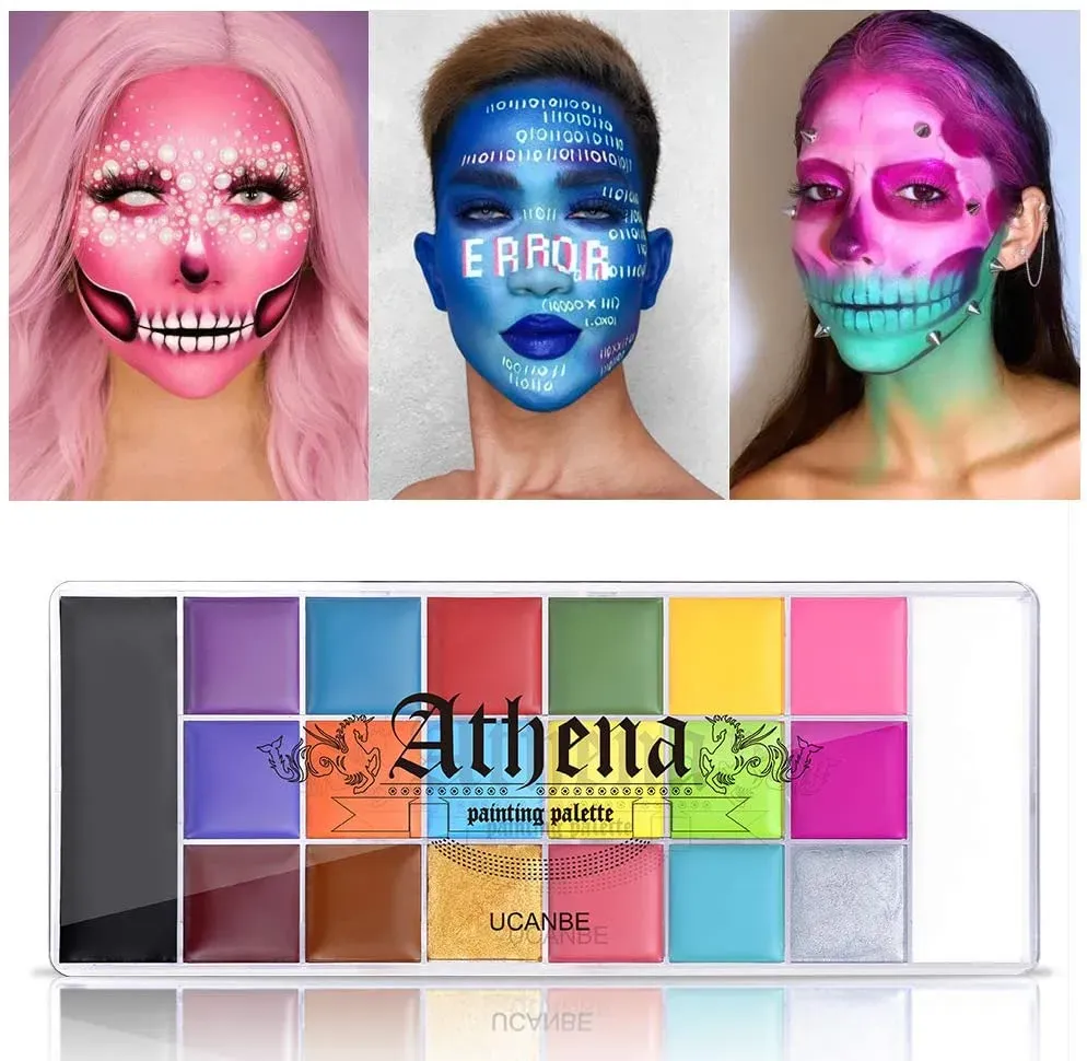 Pintura de 20 colores Athena + 10 pinceles profesionales. Con estos pinceles puedes pintar lo que quieras. Funcionan excepcionalmente bien para todos los aspectos de la pintura facial y corporal, como el trabajo de línea, el trabajo de base, la mezcla y la superposición.